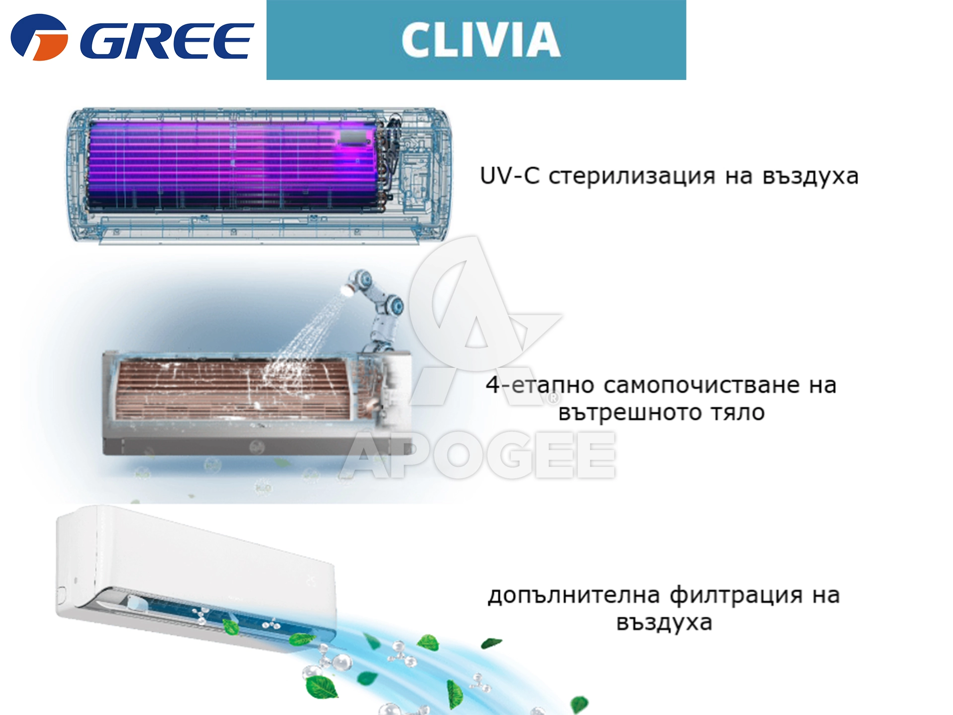 - Контрол на влажността в режим охлаждане и режим изсушаване